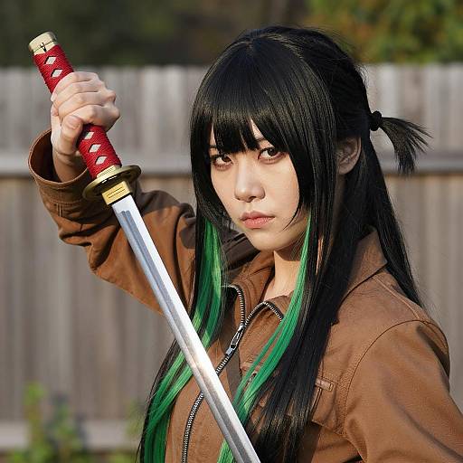 katana suicide squad cosplay,solo,weapon,sword,realistic,1girl,black hair,looking at viewer,lips,katana,japanese clothes,ponytail,upper body