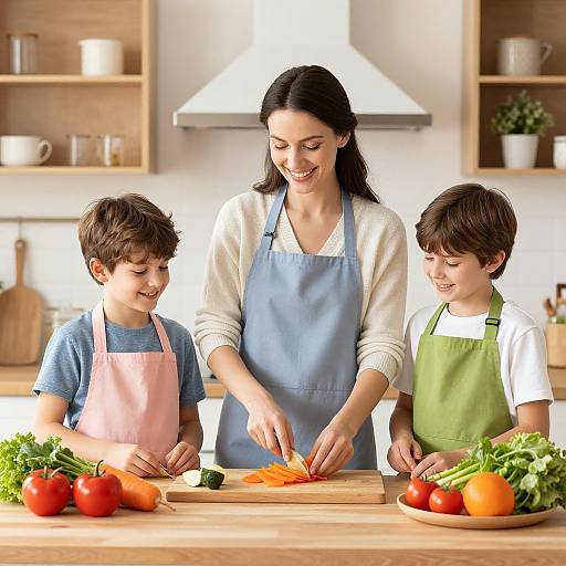 Photo prompts for kids: A cozy home kitchen where children are cooking together with colorful utensils, smiling faces, and playful food like pancakes and fruit, warm lighting, natural textures, realistic domestic scene.