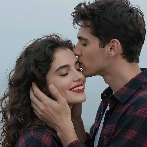 Illustration of a man and woman kissing. Man with curly dark hair, olive skin, red shirt with gold patterns, left hand on woman's chest. Woman with dark curly hair, fair skin, red and white dress, earring, eyes closed, red lipstick. Man's eyes closed. Woman's left hand on man's cheek. Textured, painterly style. Man on left, woman on right. Intimate, close-up view.