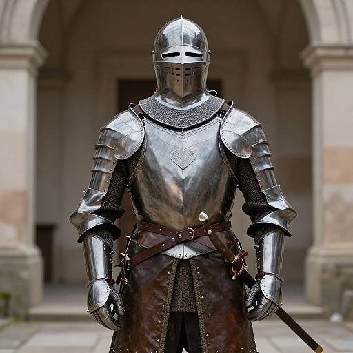 Knight Dressing Costume, knight in armor standing in a hall with a sword