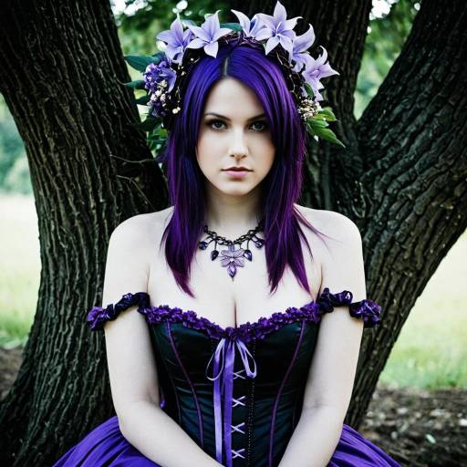 A stunning character adorned in lavender lace teddy with satin bows, with loose cascading waves, set in a soft warm glow.