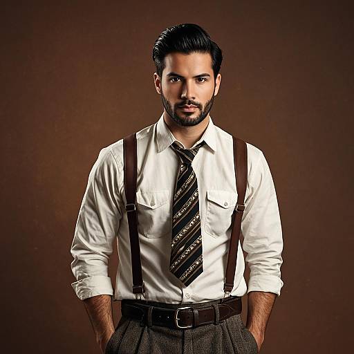 oktoberfest outfit, worn by festive couple, featuring matching stylish lederhosen with a clean cut attire, in earthy tones with hints of earthy orange, captured in a studio background with warm and balanced lighting.