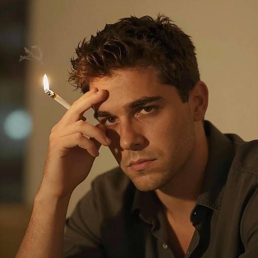 Young man with black, messy hair holds cigarette close to mouth. Pale skin, intense blue eyes. Wears white shirt, black vest, brown necktie. Background is blurred white. Right hand holds cigarette near bottom left. Upper body angled slightly downward.
