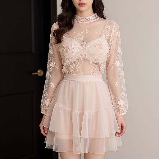 Full-length figure of a fashionista, wearing a pink pleated skirt with lace and a wide pink belt with a gold buckle, high fashion style, playful and stylish