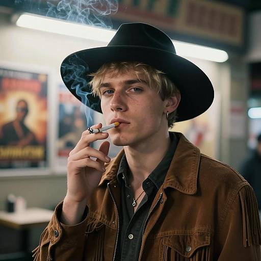 Blonde woman with fair skin, blue eyes, and light makeup, smiling broadly. She holds a cigarette in her right hand. Wearing a sleeveless white top. Her hair is pulled back. Dark, blurry background. She has small, pearl stud earrings. Close-up shot, upper body.