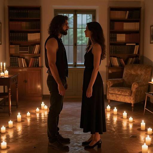 Woman with long, wavy, light brown hair holds a brass candelabrum with six lit white candles in her right hand. She wears a yellow, sheer, short-sleeved top and a gold necklace. She has a serious expression. Dimly lit, shadowy background.