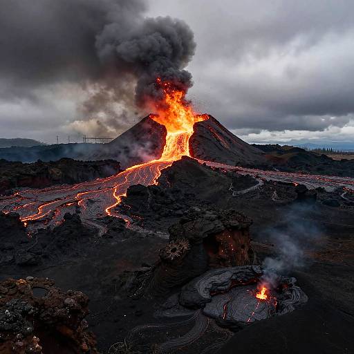 intense volcanic eruption with flowing lava, dramatic backlighting, breathtaking 8K, cinematic and hyper-detailed