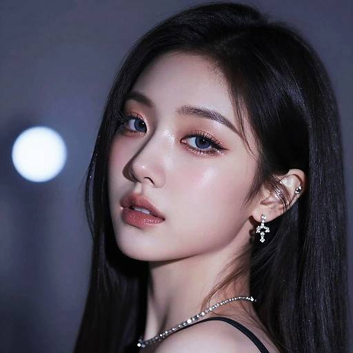 Photo-shoot, sparkly makeup artist, sleek, long ponytail, slender frame, casual outfit, glamorous and chic. Soft pastel blue studio background