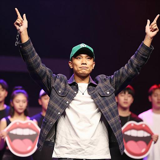 from below, 1boy, solo, muscular_male, short muscular Asian man with long black hair and determined eyes, straw_hat, open_shirt, red_shirt, denim_jeans, belt, bare_pectorals, abs, sleeveless, arms_at_sides, scar_on_face, scar_on_chest, scar_on_cheek, closed_mouth, looking_at_viewer, standing tall with arms outstretched, embroidered details softly on denim, blue background