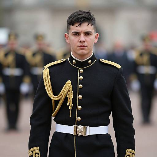 close up, solo, clean-shaven military officer with a stern demeanour, donned in decorated uniform, detailed surface texture, authoritative stance, holding a medal, red background