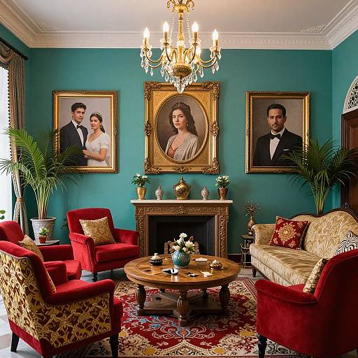 Warm brown and gold living room filled with sunlight, elegant gold-framed artwork on walls, brown leather armchairs, intricate patterned rug in gold and beige hues, large windows with sheer drapes, warm wooden coffee table, balanced mix of comfort and sophistication.