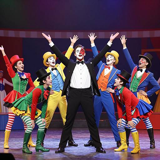 a charming jester, wearing a colorful motley costume with bells, surrounded by floating playing cards, standing in a lively carnival, illustrated in the bold and painterly anime style of Mai Yoneyama.