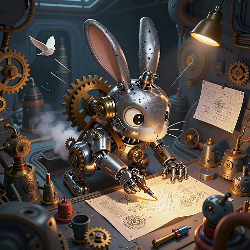 Illustration of a mechanical parrot, sipping absinthe, intricate gear aesthetics, whimsical dystopian themes, colorful hues, steampunk art.