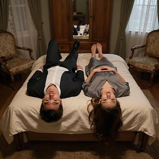 Three men in a bedroom. One shirtless, lying on a red bed with striped pants, head resting on another man's chest. Second man in white shirt, left arm around the first man's waist. Third man in gray shirt and patterned jacket, sitting on bed with legs apart, gesturing with right hand. Mirror on wall behind them. Television on right.