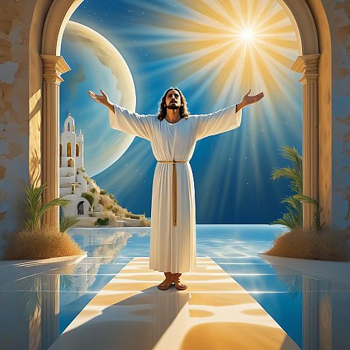 jesus costume plus size man,1boy, solo, male focus, beard, facial hair, realistic, brown hair, upper body, long hair, brown eyes, blurry, robe, looking up, white robe