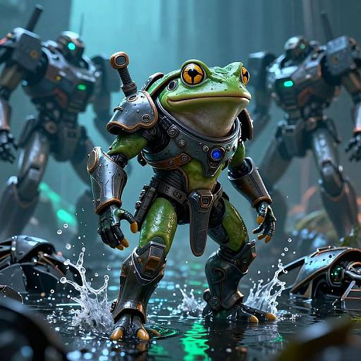 A mechanical frog leaping over a serene lake, draped in a luminous cloak. This CGI creation showcases ultrarealism, blending elements of sci-fi and fantasy art, reminiscent of Studio Ghibli's whimsical style.
