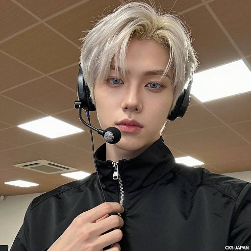 Blonde woman with long hair, fair skin, wearing black crop top, white pants, sitting on floor, back to camera, head turned, eyes closed, lips slightly parted. Background: computer monitor, audio equipment, speakers, water bottle, cardboard box, and snacks. Holding smartphone in right hand. Modern indoor setting.