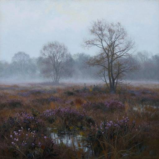 (A beautiful painting of a quiet marshland in the fog) with an ethereal atmosphere, featuring muted greys and whites blended with hints of misty lavenders. The scene is rendered with soft brush strokes, creating a serene and tranquil mood. Delicate silhouettes of tall grasses add depth, while ambient light filters through the fog. This high-resolution, ultra-detailed masterpiece captures a captivating, peaceful ambiance.