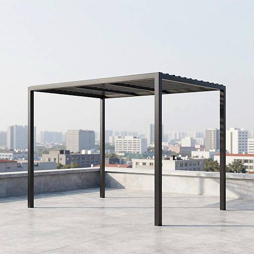 Wide exterior view of a modernist style penthouse terrace featuring sleek concrete flooring and ceiling. The area is furnished with minimalist white cushioned sofas, a round coffee table, a leather ottoman stool, and various potted plants. Large glass windows reflect the cityscape in the background, complementing the contemporary and airy ambiance of the space.