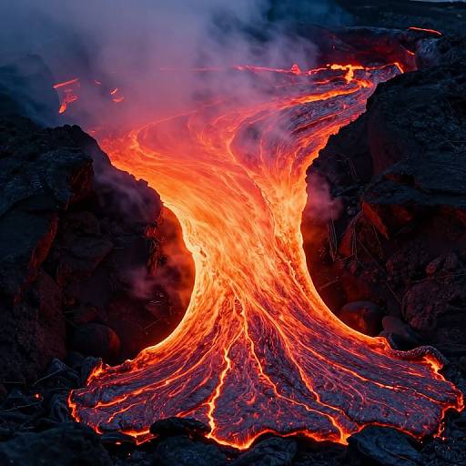 lava sculptor in heatproof outfit blending into flowing lava on a glowing magma chamber amidst magma eruptions. The scene captures a surreal fusion of human and natural elements, blending vibrant colors of blazing yellow and dynamic shadows for a dramatic, otherworldly effect.