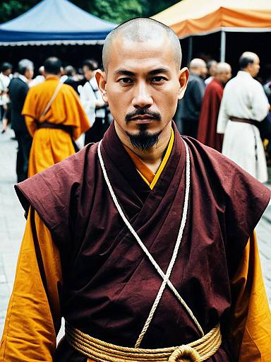 Your answer: Photo-shoot, disciplined young monk, medium length hair, muscular build, monk outfit, serene and peaceful, chic velvet drape pattern