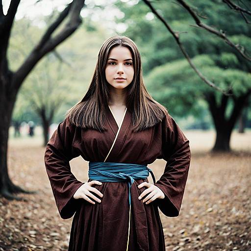An Elderly monk in traditional robes, set against a misty forest clearing.