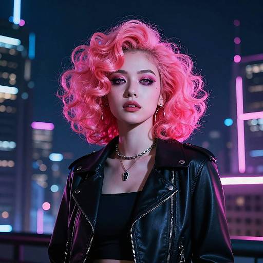 Rendered in Baroque; A trendsetting influencer experimenting with a vivid neon pink hair color transformation in a sleek penthouse