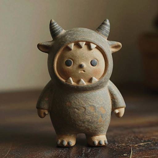 This is a close-up photograph of a small, ceramic, cartoonish monster figurine. It has a round head with two small, golden horns, large round eyes, and a mouth full of white, rectangular teeth. The monster is gray with speckles and has a cream-colored body with a brown rectangular emblem on its chest. It stands on a dark, textured surface with a blurred, grayish background. The overall style is whimsical and slightly rustic.