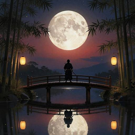 Moonlit bamboo forest glowing softly under a full moon, shadows dancing on the ground, mist weaving through the tall slender stalks, mystical and serene atmosphere, high detail