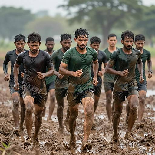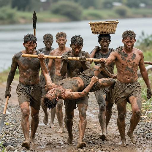 White puppy and bald baby with dirt-covered faces and bodies, sitting on muddy ground, both smiling. Background: green trees. Puppy on left, baby on right, both hands in mud. Bright outdoor setting. Photographic style.