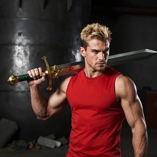 Muscular man with short dark hair holds a large assault rifle in his right hand and a flashlight in his left. He wears a black shirt and has a serious expression. Background is dark with green light reflecting off his gun.