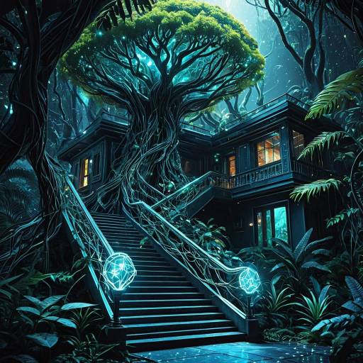 A Cascading artificial intelligence staircase climbing up into infinity, enchanted forest
