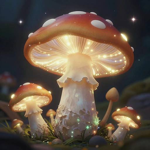 A captivating image of a pair of bioluminescent mushrooms, illuminated in enchanting macro photography style inspired by László Moholy-Nagy. Set in a temperate forest at golden hour, backlit with firefly lights, low angle shot with Nikon D850 and Nikon AF-S VR Micro-Nikkor 105mm f/2.8G IF-ED lens, focus stacking for depth, creamy bokeh background. Post-processing removes visible light sources, leaving only ethereal glow
