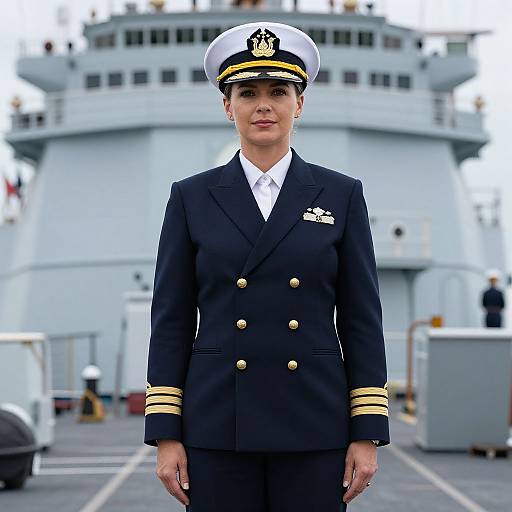 A man dressed in a classic ship captain outfit stands confidently on the wooden deck of a boat, with nautical controls and the sea visible in the background. The detailed double-breasted navy uniform with gold accents and captain's hat emphasizes a vintage maritime style.