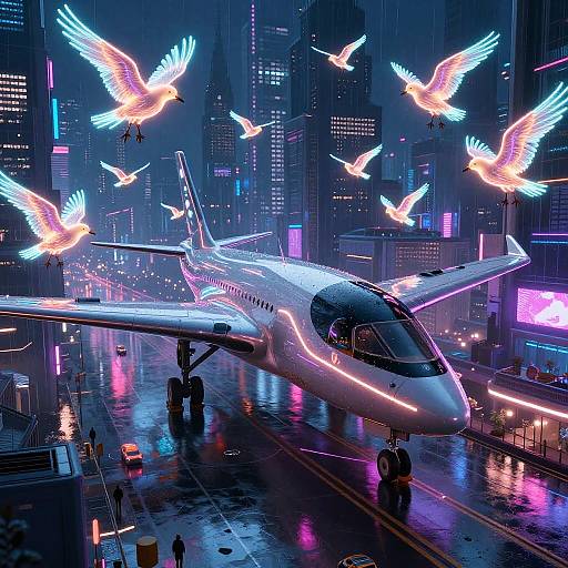 A fierce, cybernetically enhanced griffon with sleek metallic feathers covering her body. She has glowing neon-green eyes that radiate power, and wears a form-fitting bodysuit adorned with glowing circuitry patterns, accentuating her agile frame. Sharp, angular cybernetic wings extend from her back, pulsating with energy, adding a futuristic, sci-fi edge. The artwork combines elements of fantasy and high-tech design, creating a powerful, dynamic character in a vibrant, glowing palette.