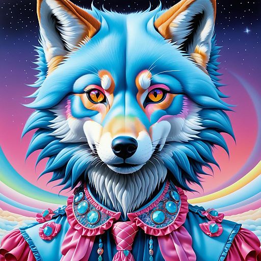 A fusion of a wolf and a girl in a standing pose, surrounded by three other wolves against a nightlife backdrop. The artwork is accented with hints of silver, navy, and crimson, adding warmth and depth to the scene. Rendered in a stylized, nighttime setting, the composition captures a surreal yet lively atmosphere, with intricate details highlighting the fusion character and the playful nature of the accompanying cats.