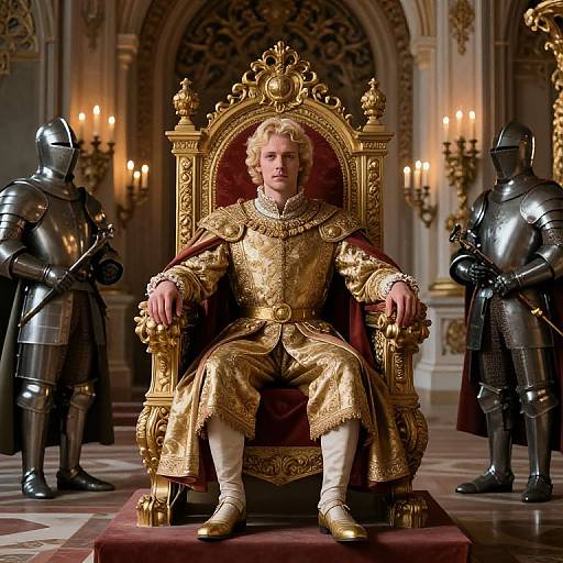 reales royal court scene with nobles in luxurious Renaissance clothing, ornate furniture, grand tapestries, a majestic throne centerpiece, dramatic lighting emphasizing the opulence and power of a historic monarchy, painted in rich, warm tones