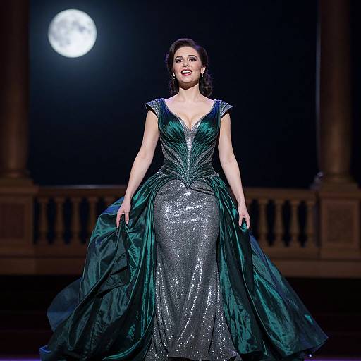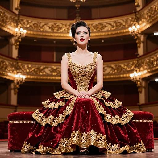Glamour photography of an elegant opera singer, wearing a dramatic floor-length gown, photographed in a grand historic opera house. The composition features professional lighting and a sophisticated atmosphere.
