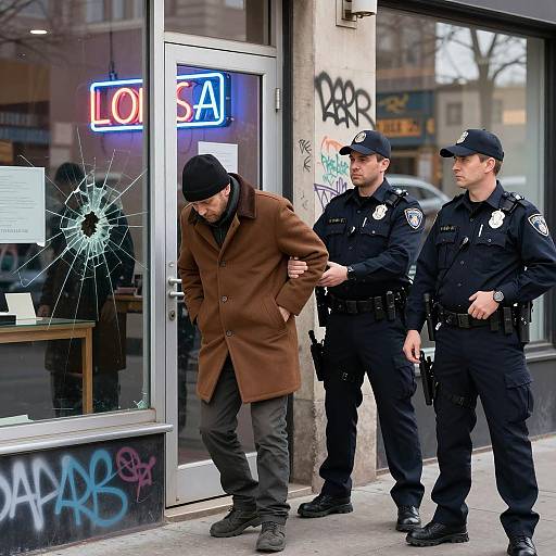Nighttime street chaos. Police in dark uniforms, some crouching, others standing, among debris. Blue police van with flashing lights on right. Large crowd in background, some with raised arms, others shouting. Broken glass, wood, and metal scattered on ground. Streetlights and car headlights illuminate scene. Police officers' expressions are focused and intense. Multiple police officers, approximately 10. Background includes building facade and street signs. Blue light from police van contrasts with darker surroundings.