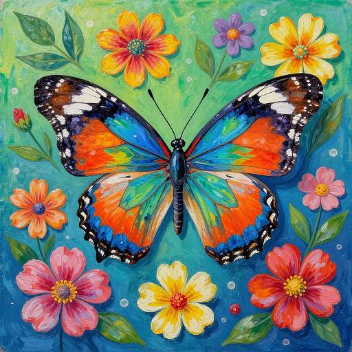 A dynamic illustration of a vibrant butterfly with orange and black wings, set against a blooming flower field. The colors transition from deep blue to fiery orange, creating a bold, striking visual effect.