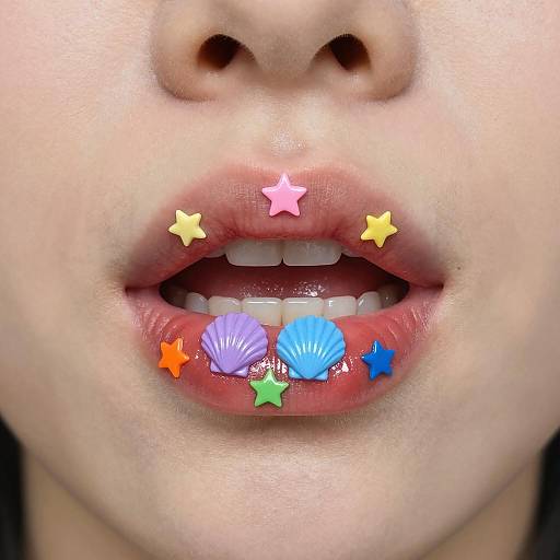 Close-up photograph of full lips painted bright pink. Lips covered in small, colorful star-shaped patterns. Teeth visible behind lips. Skin around lips is light. Star patterns include colors like yellow, blue, green, and white.