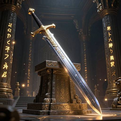an ethereal blade of ancient rarity, displayed on a ornate golden pedestal as a prominent artifact