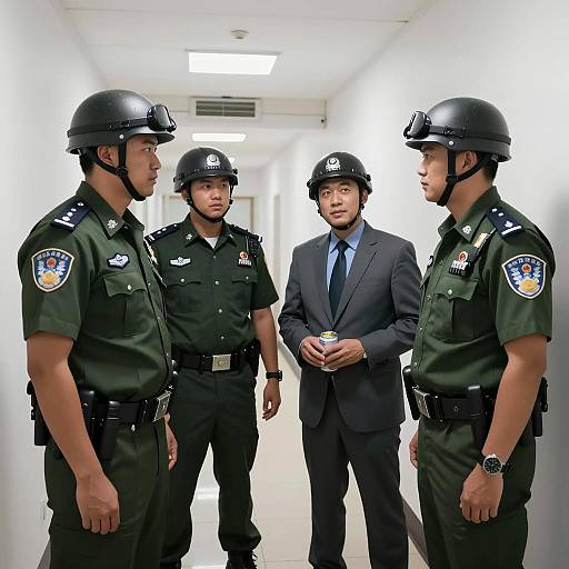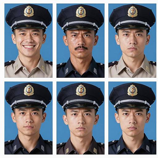 upper body, 2boys, couple, face-to-face, smile, eye contact, looking at another, outdoors, police, police uniform, mature muscular male with soft auburn hair, undercut, blue eyes, wearing a navy shirt, beige pants, police hat, collared shirt, belt, mature muscular male with silver hair, buzz cut, brown eyes, wearing a white shirt, tan pants, collared shirt, belt, goatee, yaoi, detailed clothes description, bara, large pectorals, pectoral press, sideburns, anatomy