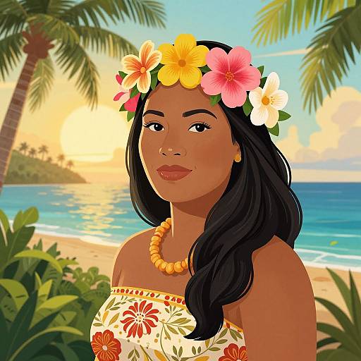 Cartoon Pacific Islander female, with curly dark hair with flowers, revealing strong physique, inspired by island tradition with bright colors