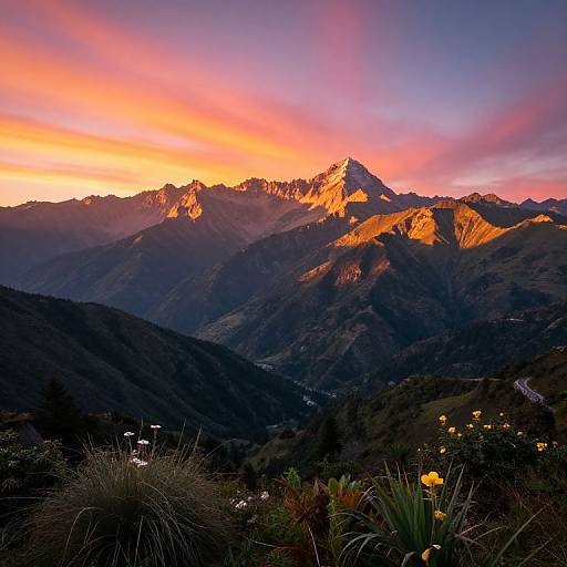 a rugged mountain landscape, illustrated in a dramatic oil painting style inspired by 19th-century landscapes, featuring lush greenery and a radiant sunset, capturing a mood of adventure and vastness, eye-catching and dynamic