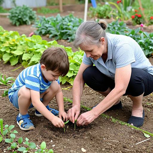 Photograph of three people in a classroom. An elderly woman with white hair in a white coat and pink shirt, a child in a white helmet and blue overalls, and a woman with brown hair in a pink cardigan. The child and elderly woman point at papers on a wooden table. Background includes colorful posters, a clock, and cabinets. The child focuses intently on the papers.