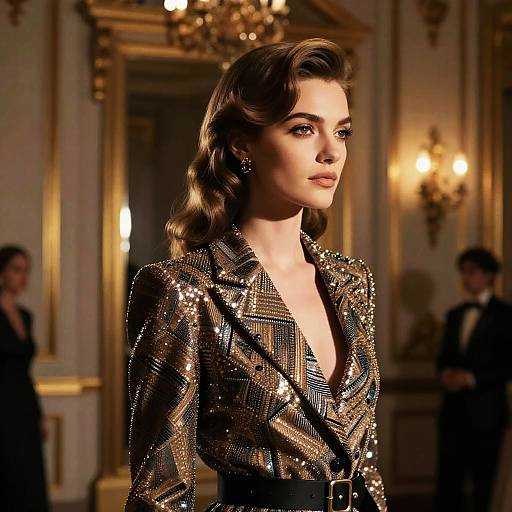 Layered Pompadour hairstyle on female model, wearing vintage dress, in classical building interior, captured in fashion editorial style with soft natural light.