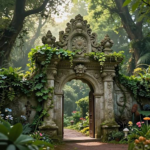 dreamy forest with towering trees and a distant view of crumbling vine-covered gate