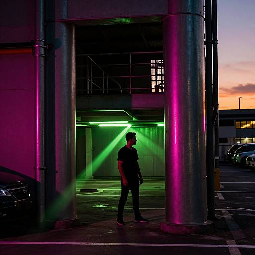 Liminal space parking garage under flickering neon lights, vast empty structure with repetitive patterns of beams and pillars, subtle mist weaving through the scene, melancholic vibe with hints of surrealism, blending industrial elements and dreamlike quiet stillness.