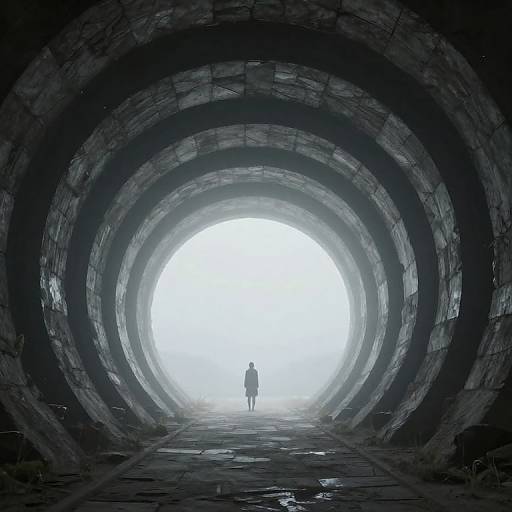 Candlelit pathway winds through a misty forest, lined with tall, bare trees and mirrored by a tranquil stream reflecting the flickering flames and silhouetted branches above.